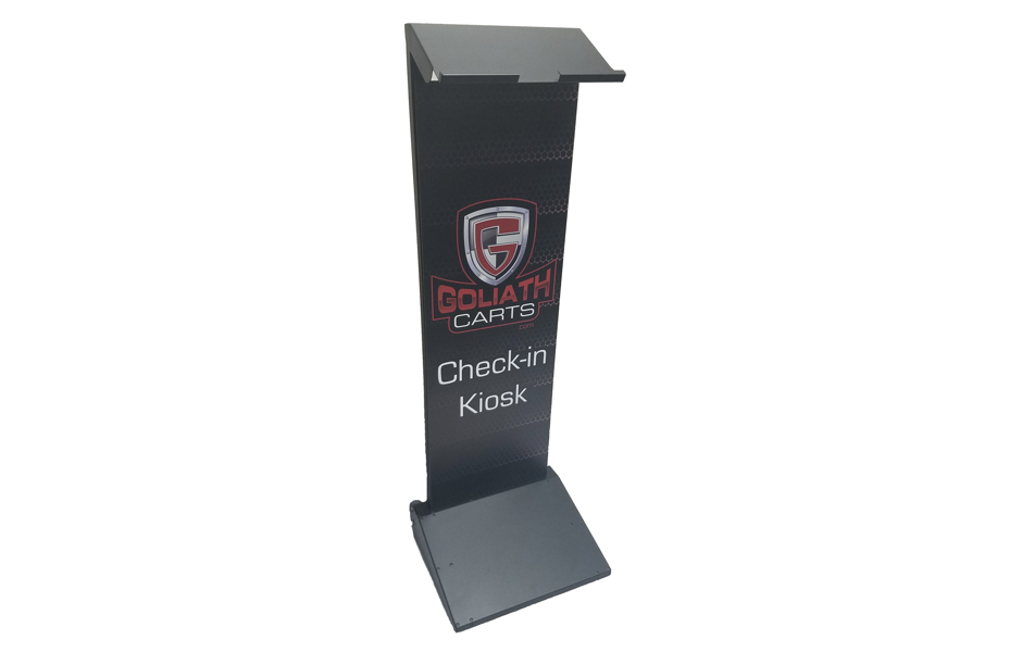 Attract and Engage the modern consumer with the Goliath Carts Check in Kiosk. Utilizing CCC’s latest software module with the proven quality and engineering of Goliath Carts, you have a lobby presence that will allow your technology driven consumer to check in to your facility and this data will seamlessly flow into your shops workflow. Our Check in Kiosks lock to secure the tablet and are universal to fit most Tablet models and sizes. Additionally, our Floor Standing version is “Brandable”. Apply your own graphics to customize your stand and branding!