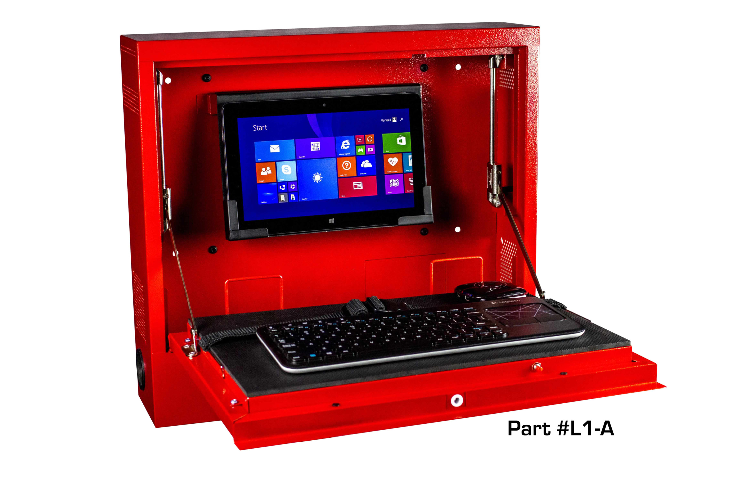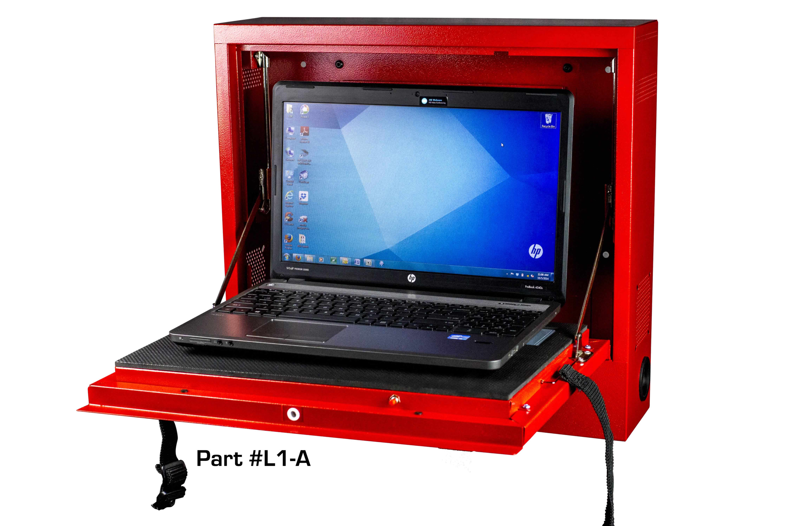 Base Model Laptop Locker (Part #L1-A): Includes the laptop cabinet that can be mounted to a wall. Has an electronic touch pad to allow technicians to access and keep electronics secure.