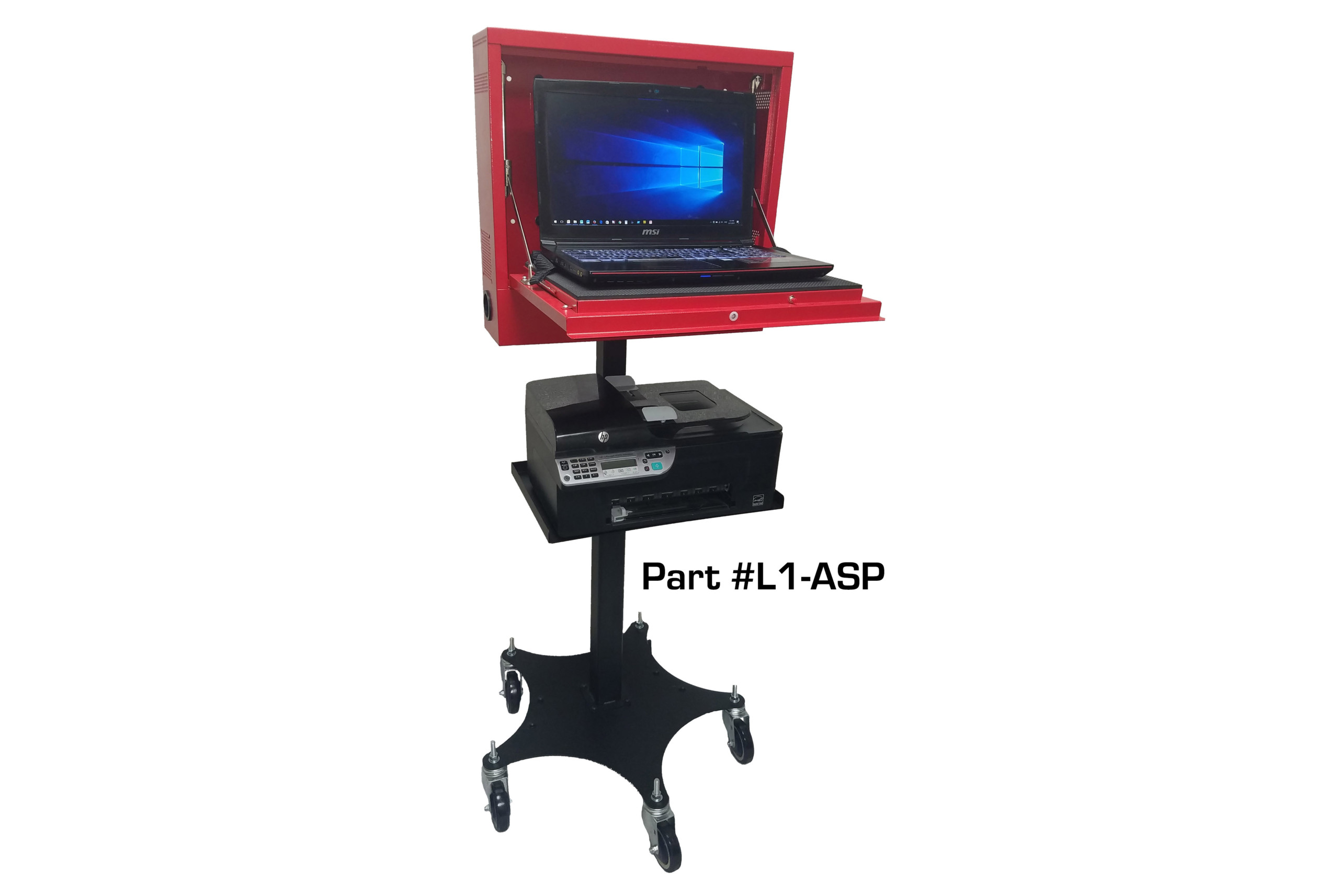 L1A Laptop Locker with Stand and Printer Shelf (Part #L1-ASP): Includes the laptop cabinet with electronic touch pad locking feature and stand to mobilize the unit, as well as a steel printer shelf to create a mobile workstation that supports both “Sit” and “Stand” use.