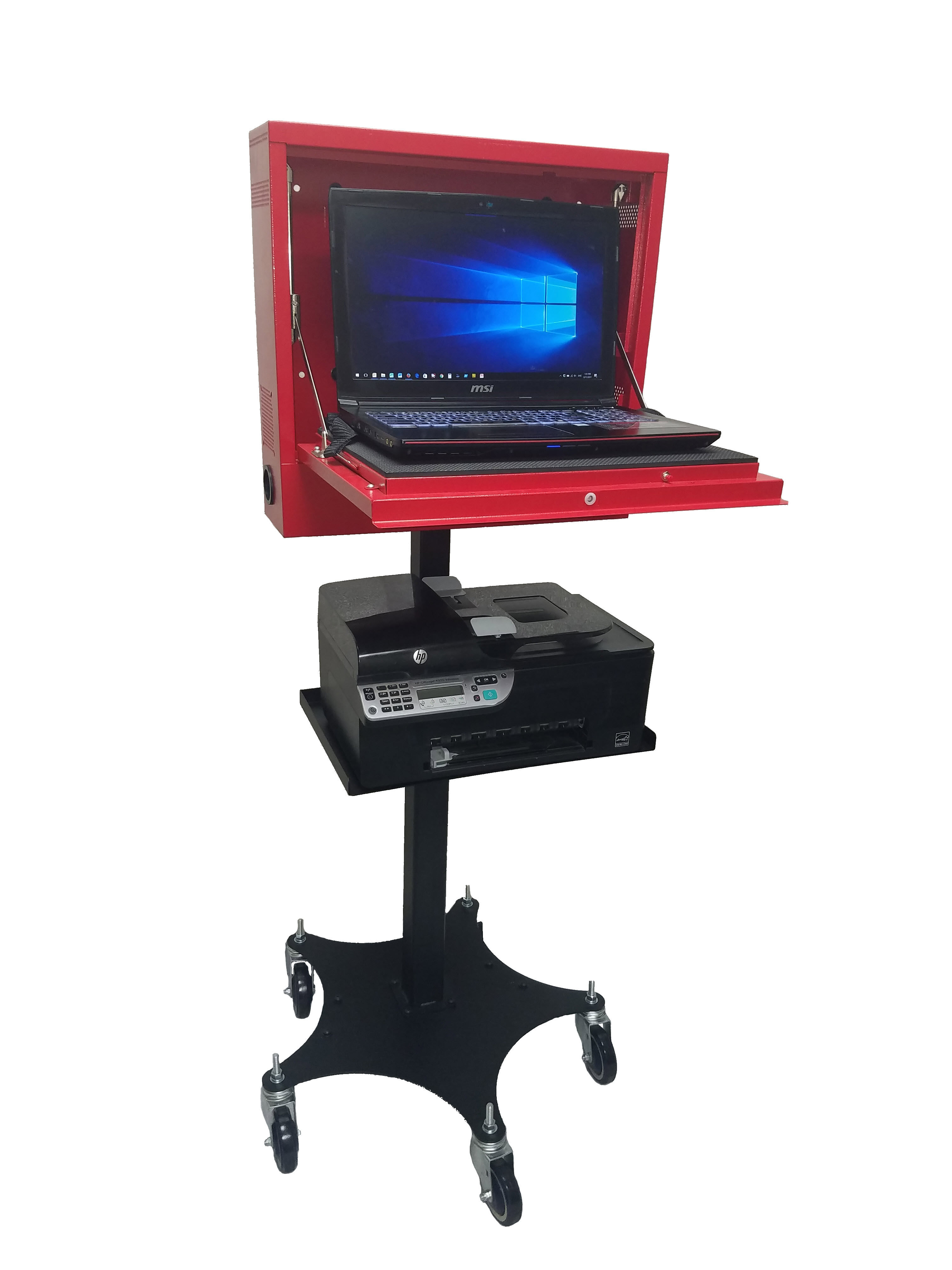 Mobile laptop locker with keyless entry and integrated printer shelf. Secure, organized, and built for shop mobility.