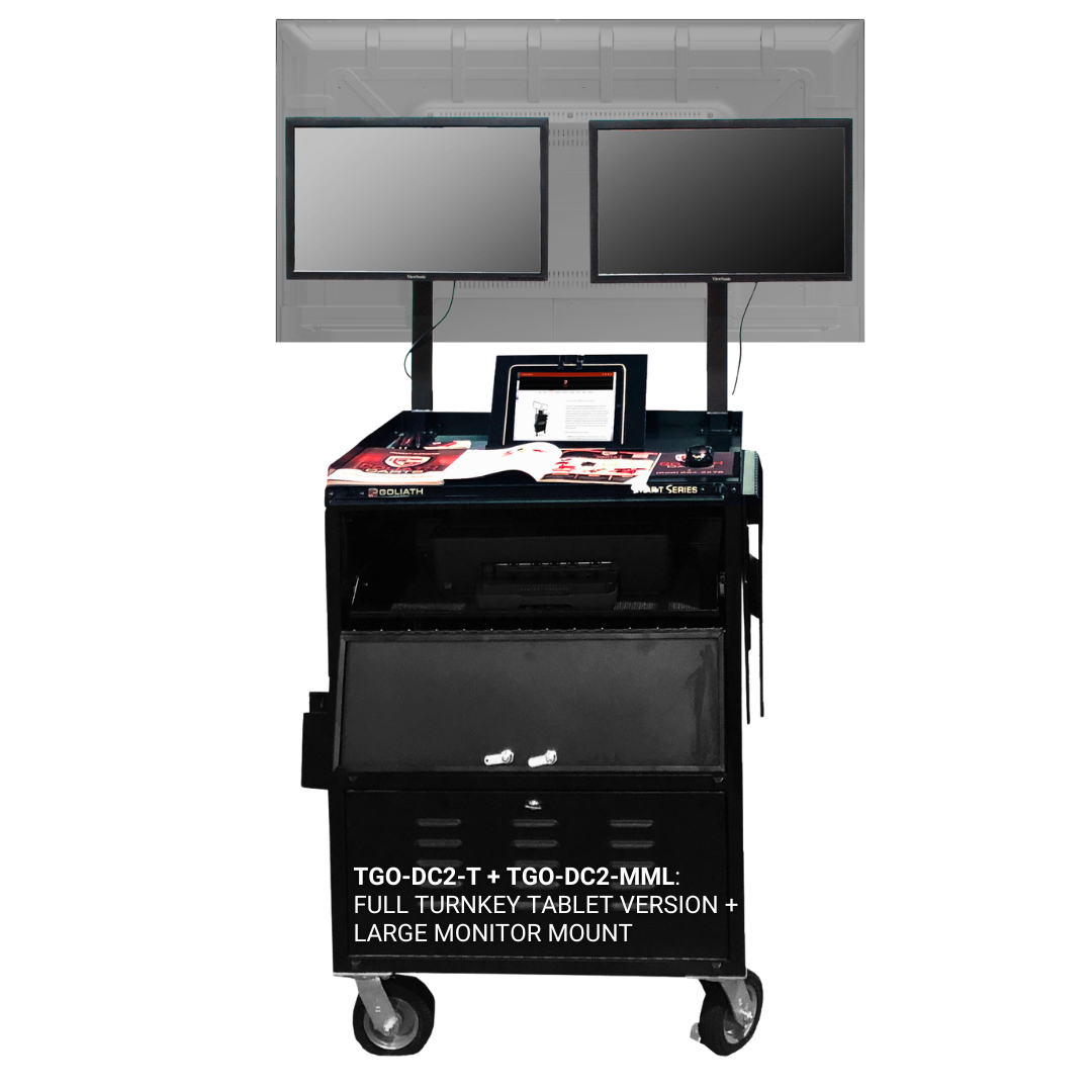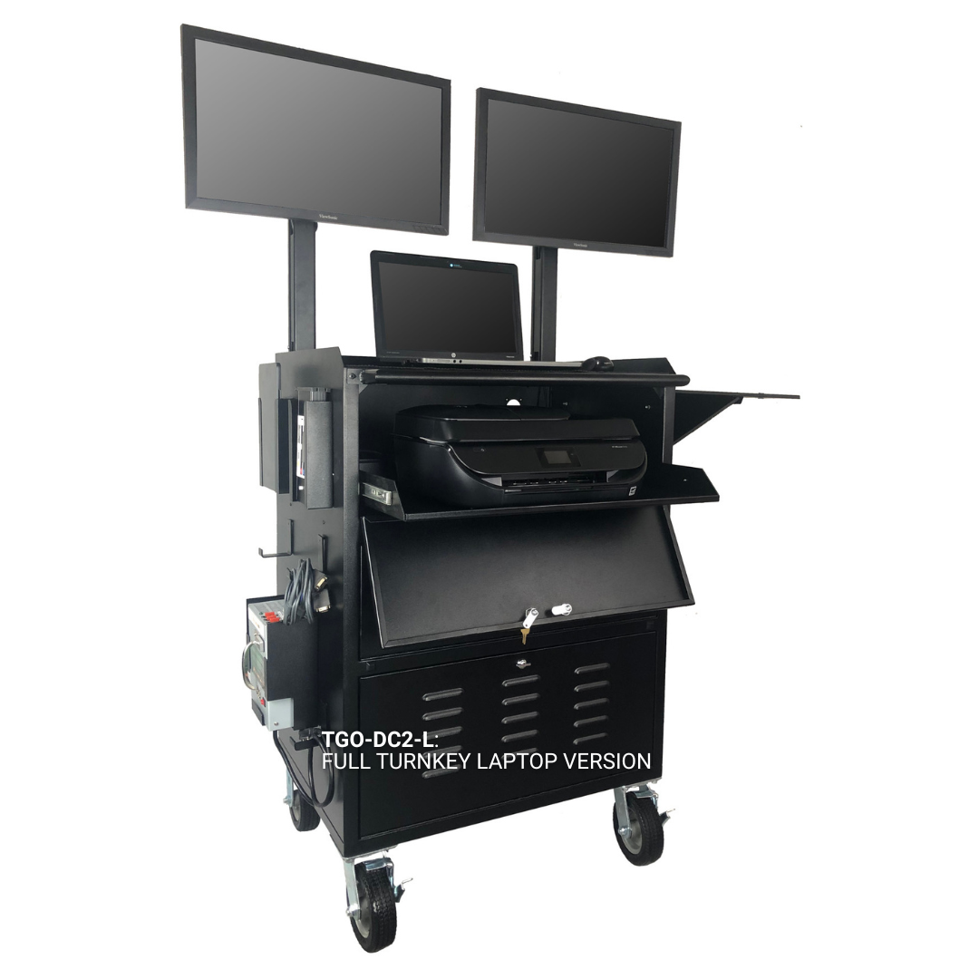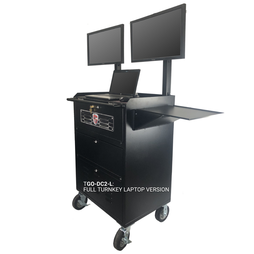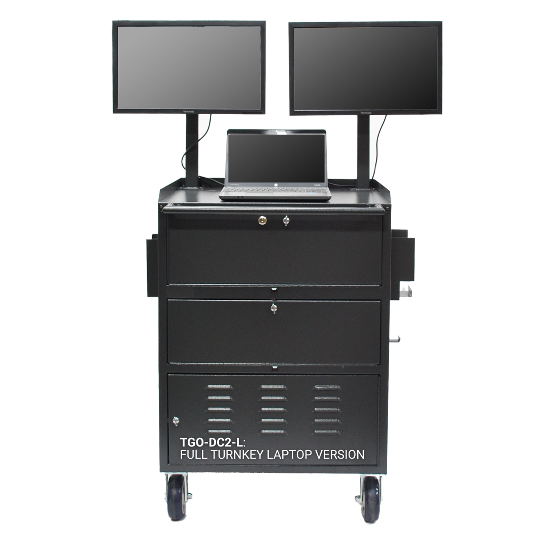 The TGO-DC2 is the big brother of our flagship product, the G1-A “Go Cart”. This product is a rugged tri-screen mobile powered workstation that is built for a multitude of job requirements – including, but not limited to, estimating, calibration, scanning, and diagnostics. All necessary equipment can be mounted on the side for a truly mobile solution. The adjustable cubbies on the side fit most scan tools and tablets. There are locking cabinets to store and secure all electronics and necessary equipment. This cart drastically increases accuracy and productivity while reducing wasted movement. The TGO-DC2 is self-powered and can run for up to four days on a single charge, allowing the user to maintain productivity levels for long periods without losing power.